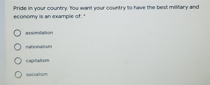 Pride in your country. You want your country to have the best military and economy is an example of: A. assimilation B. nationalism C. capitalism D. socialism