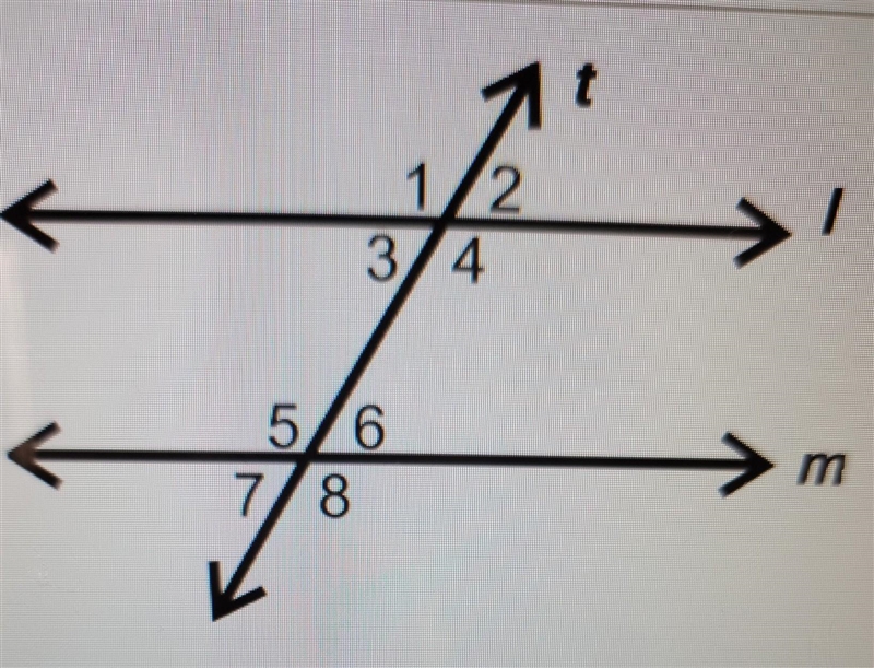 Lines land m are parallel lines cut by the transversal line t Which angle is congruent to 1? A) 3 B) 6 C)7 D)8