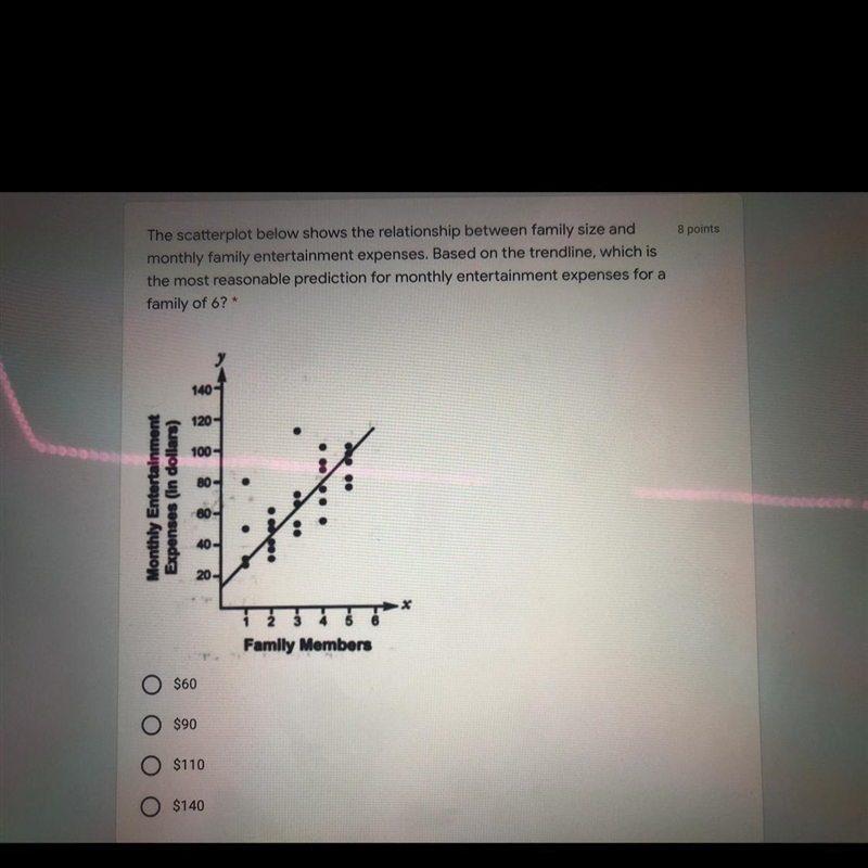 The scatterplot below shows the relationship between family size and monthly family entertainment expenses. Based on the trendline, which is the most reasonable prediction for m…