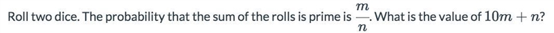 If you roll two dices, you can get as results all numbers from 2 to 12. Among these, the prime numbers are 2, 3, 5, 7, 11. The probability you get each of them is: 2: you can get it only as 1+1, so one combination over 36 possibility. Probability: 1/36. 3: you can get it as 1+2 or 2+1, so two combinations over 36 possibility. Probability: 2/36. 5: you can get it as 1+4, 2+3, 3+2, 4+1, so four combinations over 36 possibility. Probability: 4/36. 7: you can get as 1+6, 2+5, 3+4, 4+3, 5+2, 6+1, so six combinations over 36 possibility. Probability: 6/36. 11: you can get it as 5+6 or 6+5 so two combinations over 36 possibility. Probability: 2/36. The total probability of getting a prime number is the sum of the probabilities, which is 15/36. So m=15, n=36 and 10m+n=150+36=186.