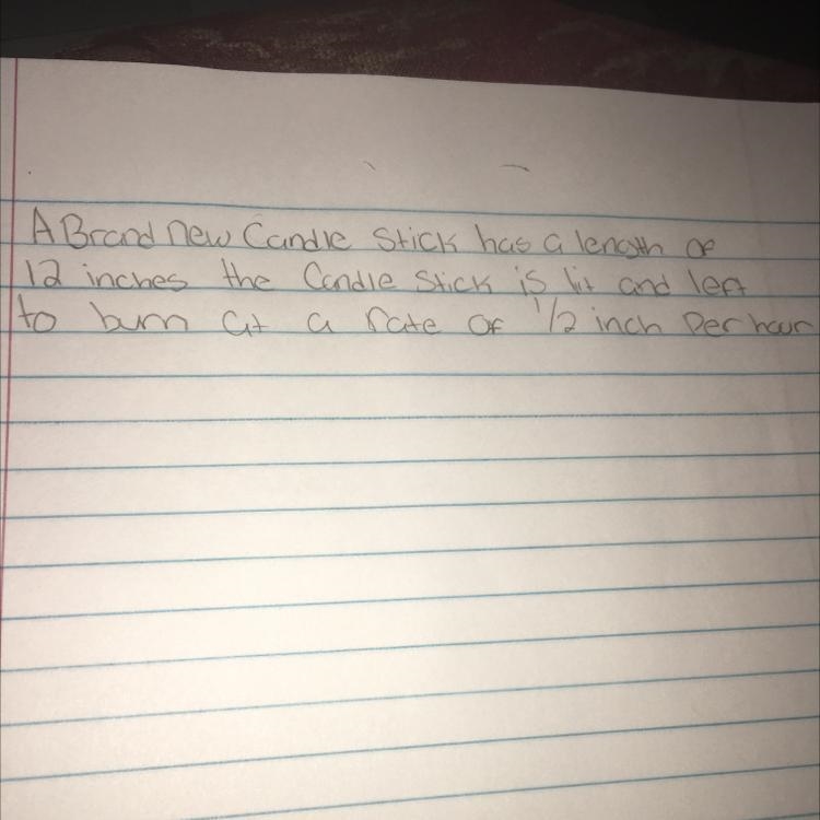 9 1/2 (9.5) inches. If the candle burns at a rate of 1/2 an inch per hour, after 5 hours it will have burned 2 1/2 inches (5x1/2). If the original height was 12 inches, and it burned down 2 1/2 inches, you would do 12-2.5 to get a final length of 9 1/2 inches.