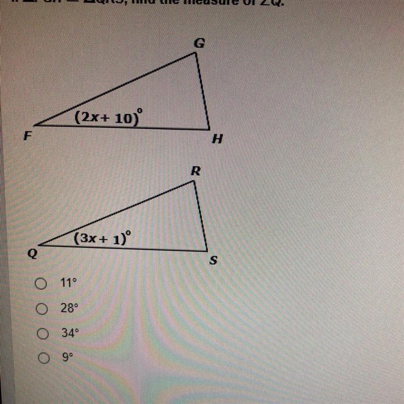 If FGH QRS, find the measure of Q A. 9 B.28 C.11 D.34
