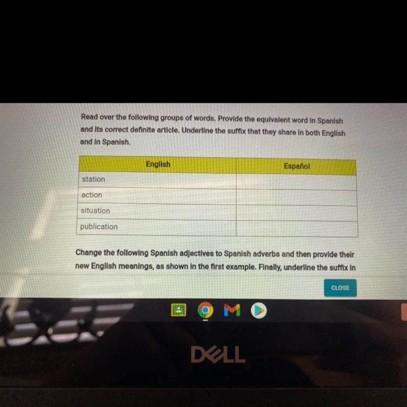 Read over the following groups of words. Provide the equivalent word in Spanish and Its correct definite article. Underline the suffix that they share in both English and in Spa…
