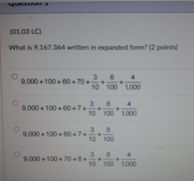 B: 9,000+ 100 + 60 + 7 + 3/10 +6/100 + 4/1000