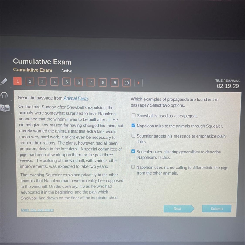 It's seen that Squealer was actually speaking to the other animals on behalf of Napoleon. This actually shows that Napoleon was talking to the animals through Squealer. Also, in Squealer's speech, we discover that he uses glittering generalities to describe the tactics of Napoleon.