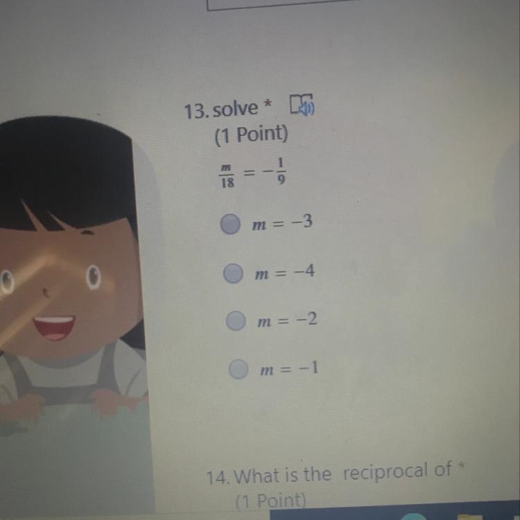 13. solve (1 Point) m/18 = - 1/9 a.) m = -3 b.) m = -4 c.) m = -2 d.) m = -1
