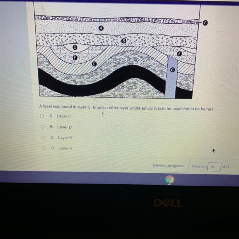 Since Layer D and Layer C are on the same elevation, we could assure that a fossil is found on these layers while Layer B, A, and F are above Layer C in which is less likely to find a fossil on these layers than on Fossil D.