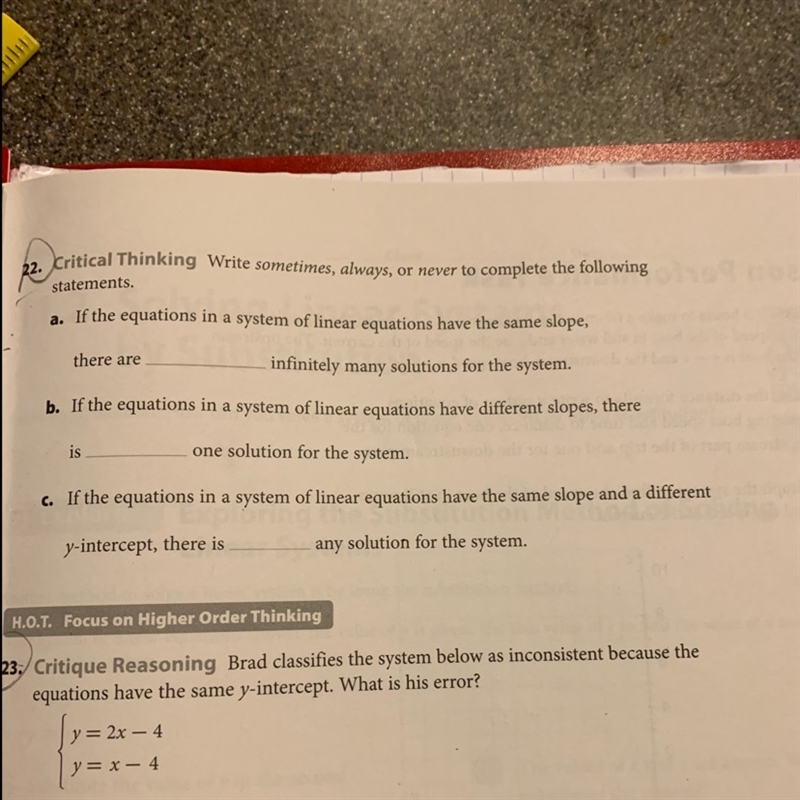 22a If two lines have the same slope, they can either be parallel lines which never intersect and have no solution or the same line which have infinite solutions. So there are sometimes infinitely many solutions to the system depending on if they are the same line or are parallel lines