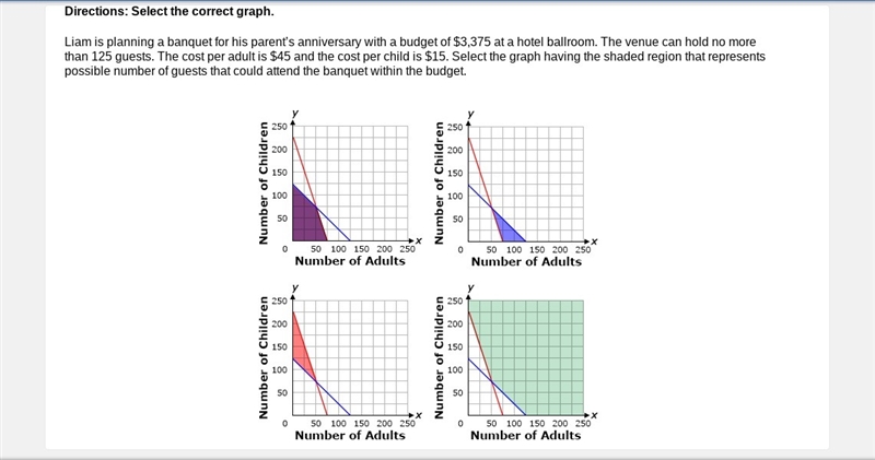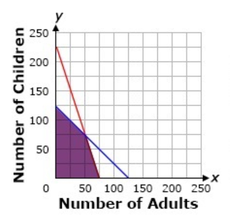 Clearly, 0 guests (0 adults, 0 children) will satisfy the limits on budget (≤ $3375) and number of guests (≤ 125). The only graph that includes (0, 0) in the solution set is the one shown below.
