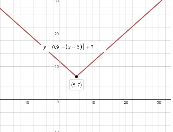 What are the maximum and minimum of the function f(x) = 0.9|-(x − 5)| + 7?