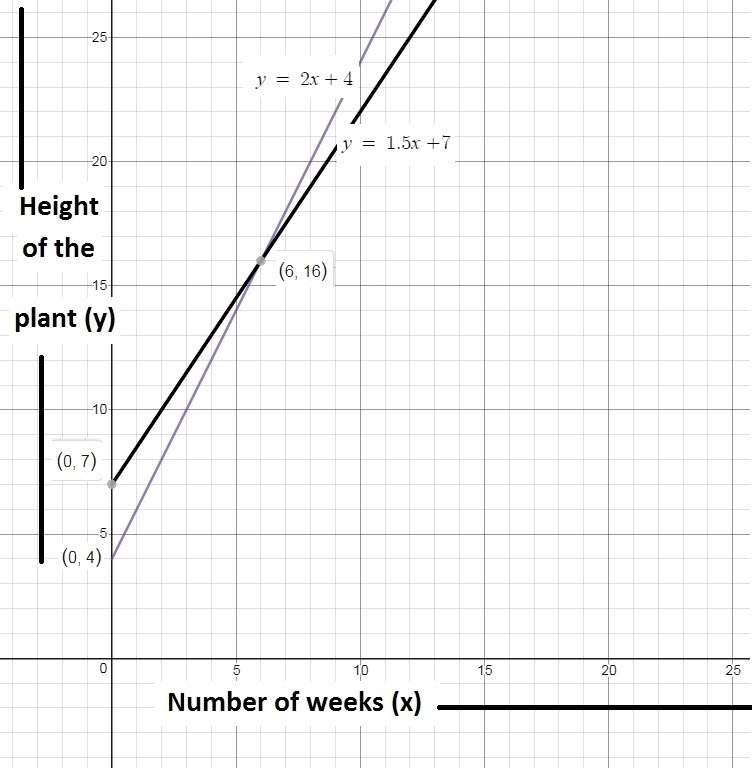 Assessment items Mrs. Sheng has two batches of bamboo plants that she will use to make a fence with poles of similar heights. When she transplanted the plants, the first batch, which grows at a rate of 2 ft/week, had stalks that were about 4 ft high. The second batch, which grows at a rate of 1.5 ft/week, had stalks that were about 7 ft high. The equation y=2x+4 y=2x+4 models the height, y, of the plants in the first batch x weeks after they were transplanted. The equation y= 3 2 x+7 y=32x+7 models the height, y, of the plants in the second batch x weeks after they were transplanted. Graph the system formed by the equations.
