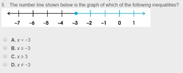 5. A solid dot means the number is included in the answer. The line is blue from -3 up, so the answer would be B. X≥-3