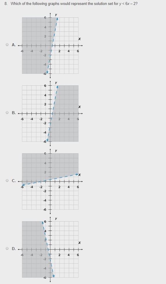 6. The equation has a less than sign, so the shaded portion would be to the right of the line. This makes graph B the correct one.