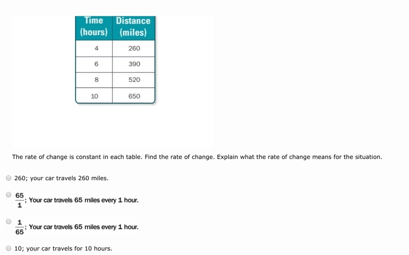 65/1; Your car travels 65 miles in one hour (aka 65 miles per hour)