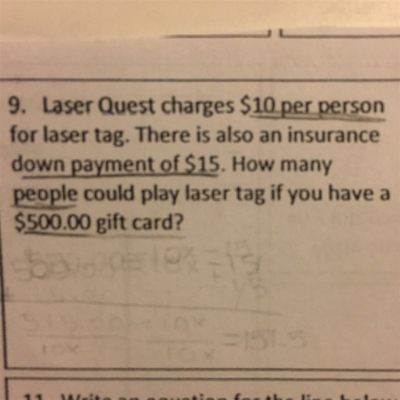 This problem represents a linear equation since there is a constant rate of change, in this case a rate of $10 per person. There is also an initial rate of $15 that must also be paid. Since you have a $500 gift card, you can set an equation to find the number of people that would be able to play laser tag based on the costs and your total spending money: