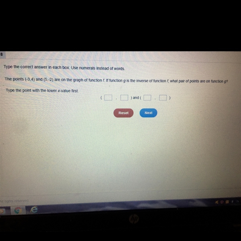The inverse of the function is the reflection across the line y=x. This means (x,y) is (y,x). So (-3,4) becomes (4,-3) and (5,-2) becomes (-2,5).