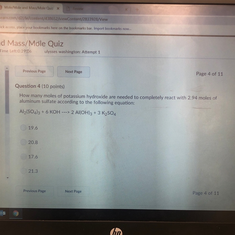 So, Third choice is correct, 17.6 moles of potassium hydroxide are required to react with 2.94 moles of aluminium sulfate.