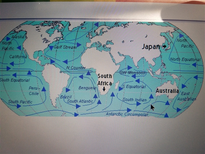 Ocean currents that move away from the equator carry warm, moist air and ocean currents that move away from the poles carry cooler, dryer air. Based upon this information in the map above, which of the following statements is true?