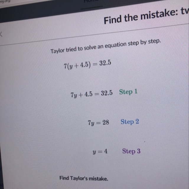 Taylor tried to solve an equation step by step. 7(y+4.5)= 32.5 Step 1. 7y + 4.5= 32.5 Step 2. 7y= 28 Step 3. y= 4 Find Taylor’s mistake. choose one answer: A) Step 1 B) Step 2 C) Step 3 D) Taylor didn’t