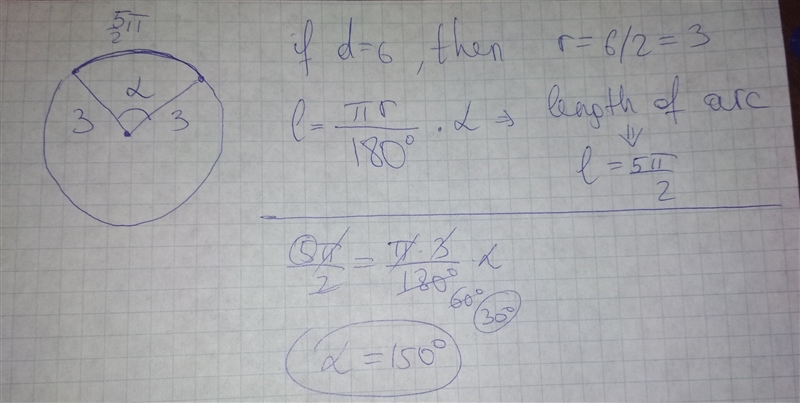 For a circle with a diameter of 6 meters ,what is the measurement of a central angle (in degrees) subtented by an arc with a length of 5/2pi meters