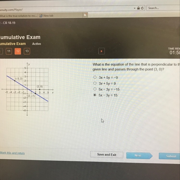 Step-by-step explanation: We are given to find the equation of a line that is perpendicular to the graphed line and passes through the point (3, 0).