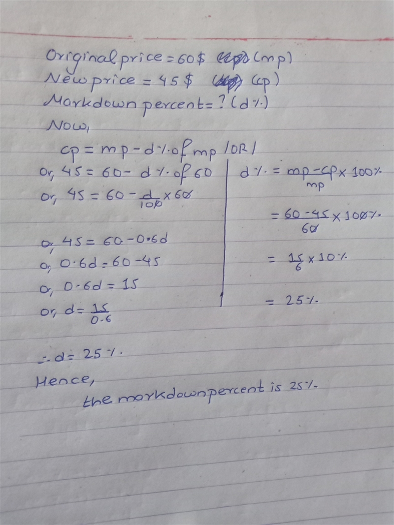 ORIGINAL PRICE: 60$ MARKDOWN PERCENT: ?? NEW PRICE: 45$ Plz help with steps because I have a test tomorrow! Thank you!