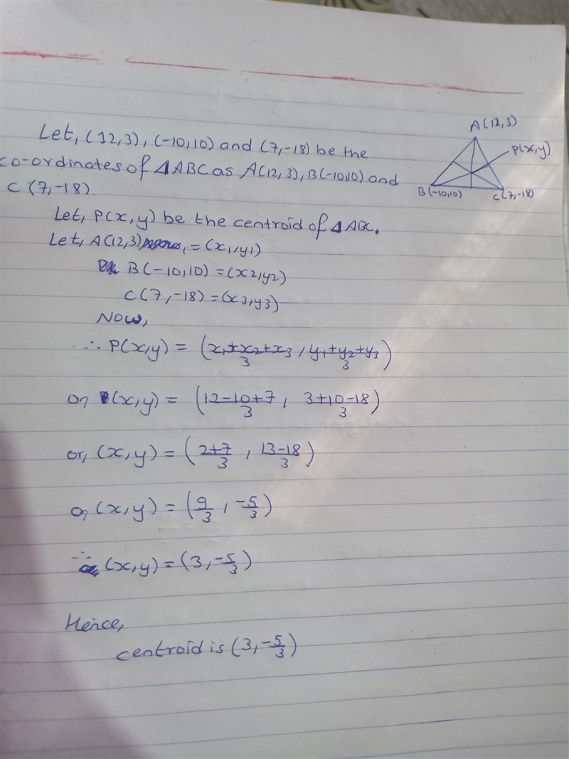 A triangle has vertices at (12,3), (-10,10), and (7,-18). What is the coordinate of the centroid?