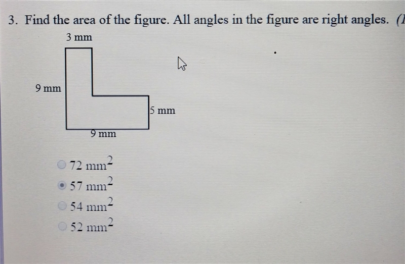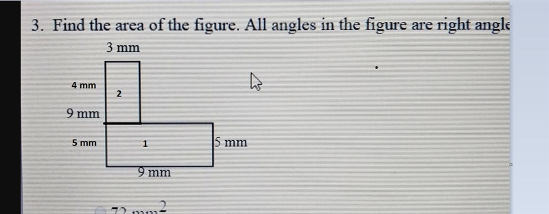 The area of figure is the sum of the area of rectangle (with dimensions 9 mm × 5 mm) and the second rectangle ( with dimensions 3 mm × 4 mm )