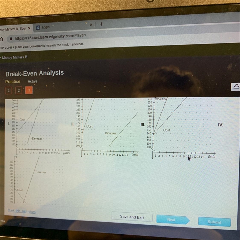 We can see in the first graph that the line of the cost and revenue meet when there are 8 quilts sold.