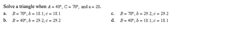 The answer is (c) ⇒ B = 70° , b = 29.2 , c = 29.2