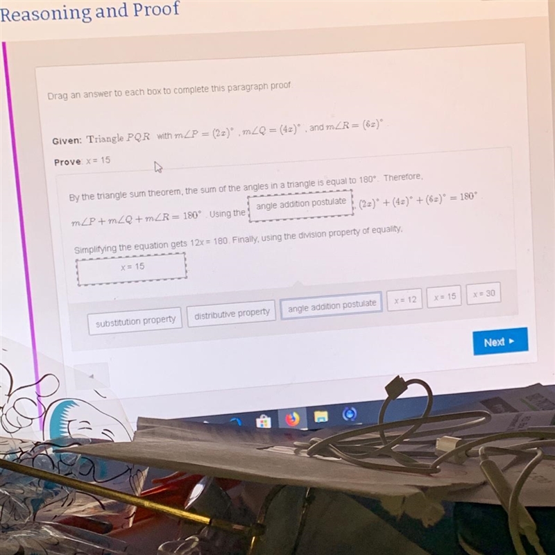 Drag an answer to each box to compete this paragraph proof.-example-1