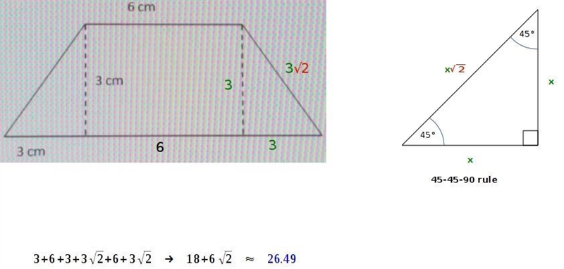 Find the perimeter of the trapezoid. a) 18 cm b) 18 + 6 √(2) cm c) 18 √(2) cm d) 24 + 6 √(2) cm please help me :"<