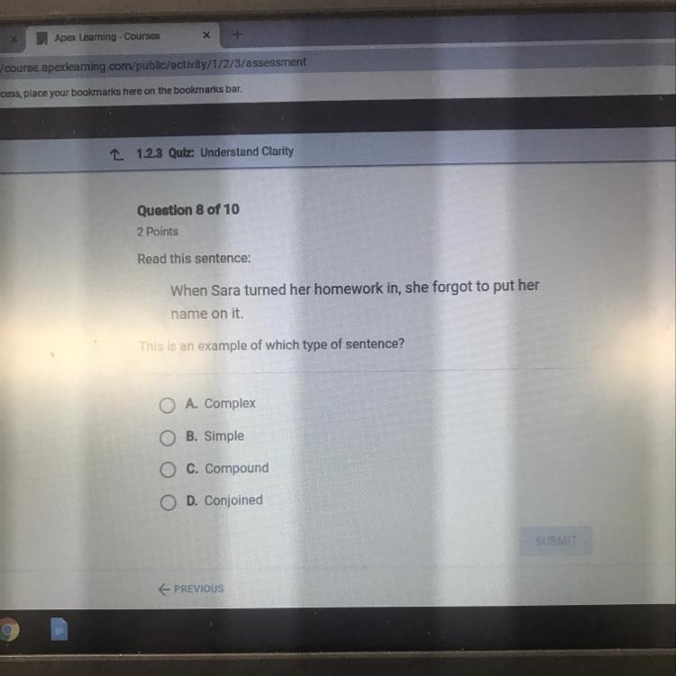 The sentence given is structured like a complex sentence: It has a dependent clause, which it's When Sara turned her homework in and a dependent clause: she forgot to put her name on it.