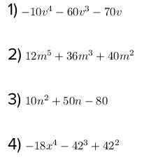 1) -10v^4 - 60 v³ - 70v involves the common factor -10v in all three given terms. Thus, -10v is the GCF. The quotient is v³ + 6v² +7.