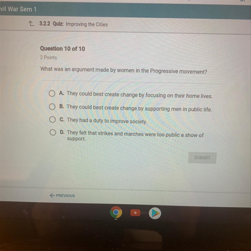B. Because the progressive movement was after the war and women had started working because men went off. Im sure its B