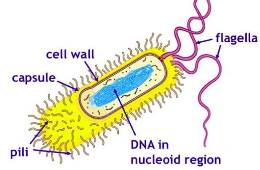 One structure you would most likely see in a bacterial cell is called a plasmid. Plasmids are small, circular pieces of DNA that are only found in the nucleoid region of bacterial cells (not pictured in attached image).