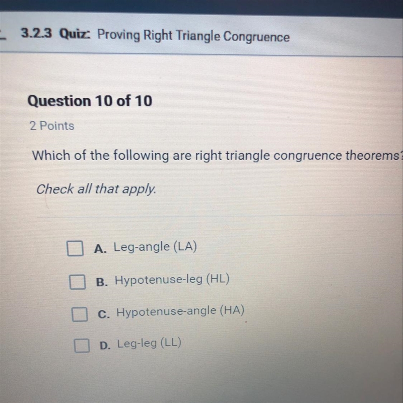According to this theorem, if the leg and an acute angle of one right triangle are congruent to the corresponding leg and acute angle of another right triangle, then the triangles are congruent.