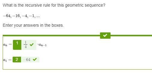 What is the recursive rule for this geometric sequence? -64,-16,-4,-1, ... Enter your answers in the boxes An= __ •an-1 A1= __