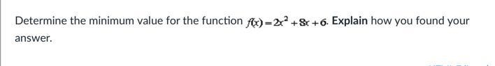 the minimum value means the vertex, and to find the vertex use the formula -b/2a which would give you -2 which is the axis of symmetry then plug in -2 for x to get the minimum value. 2(-2)^2 + 8(-2) + 6 = 8 - 16 + 8 = -2 .the vertex point would be (-2,-2)