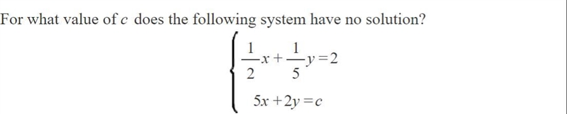 The two equations already have the same slope, -2.5, so that means they just can't have the same y intercept. the first one has a y intercept of 10, so that means the other one cannot have that. The y intercept for the second one is .5c, so in otherwords .5c can't equal 10, or c≠20.