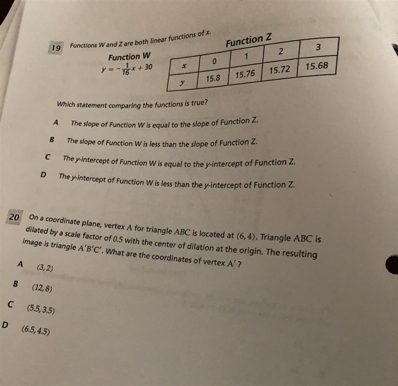 Question 20: The reason the answer is A. is because the triangle is dilated by 0.5 which is the same as multiplying the coordinates of point A by 0.5 or by 1/2 which is the same as dividing the points by 2.