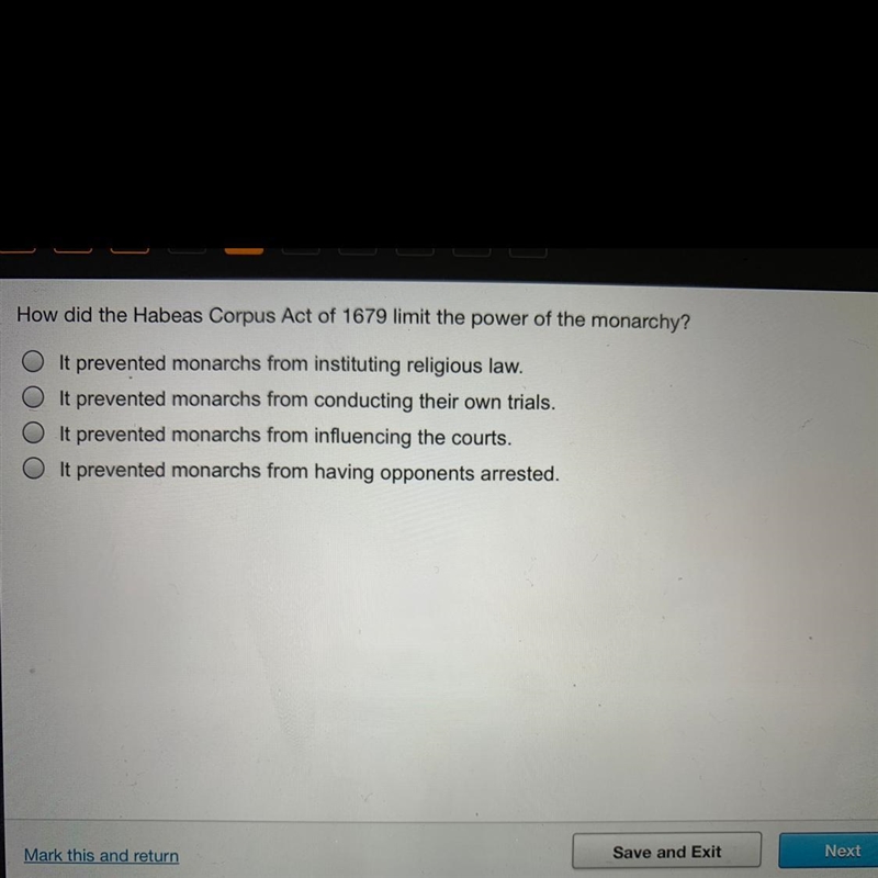 The Habeas Corpus Act of 1679 limited the power of the monarchy by preventing monarchs from having opponents arrested.
