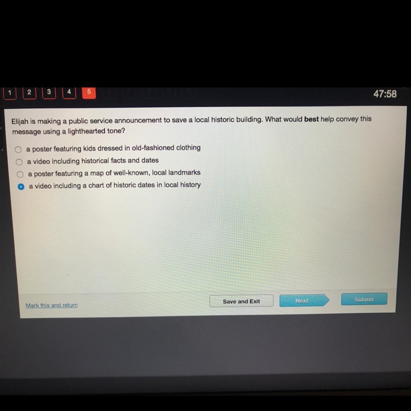 Elijah is making a public service announcement to save a local historic building. The best way to help convey this message using a lighthearted tone would be a poster featuring kids dressed in old-fashioned clothing.