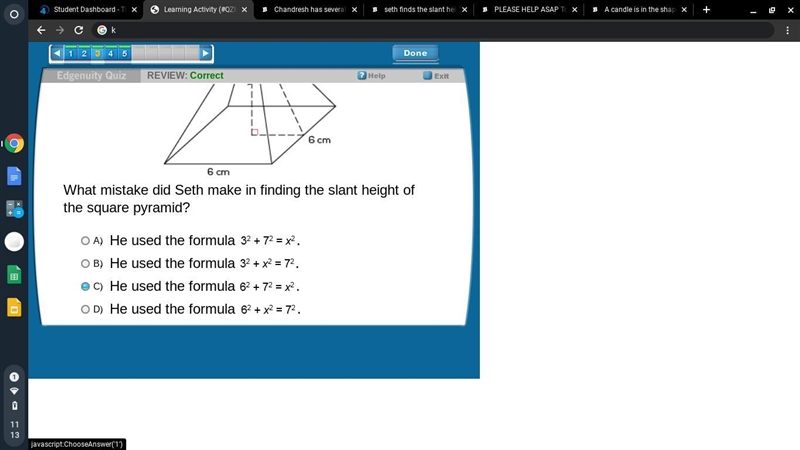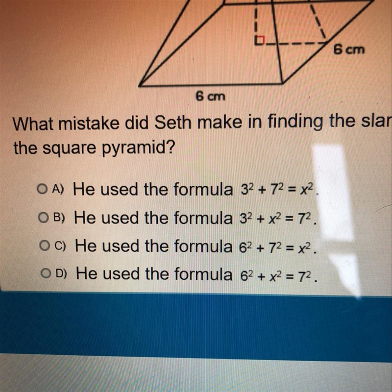 Seth finds the slant height of a square pyramid with a base length of 6cm and a height of 7 CM to be approximately 9.2 cm. what mistake did Seth make in finding the slant height of the square pyramid