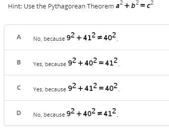 The cross-section of a ramp is a triangle with side lengths of 9 inches, 40 inches, and 41 inches. Is this a right triangle?