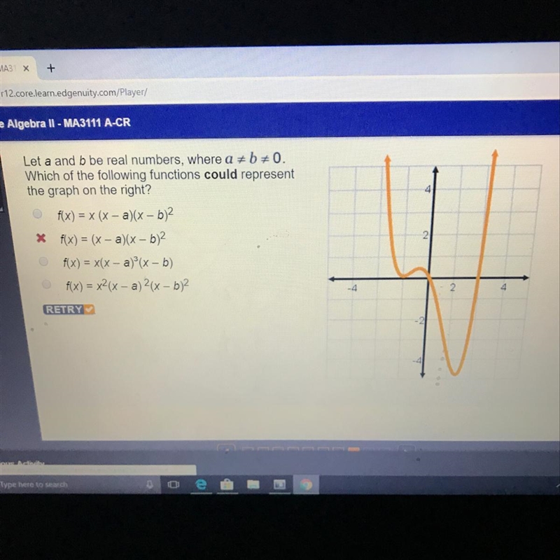 This is an even polynomial because both ends end up. This means the degree of the polynomial is even. This means b and c are not solutions since their degrees are odd.