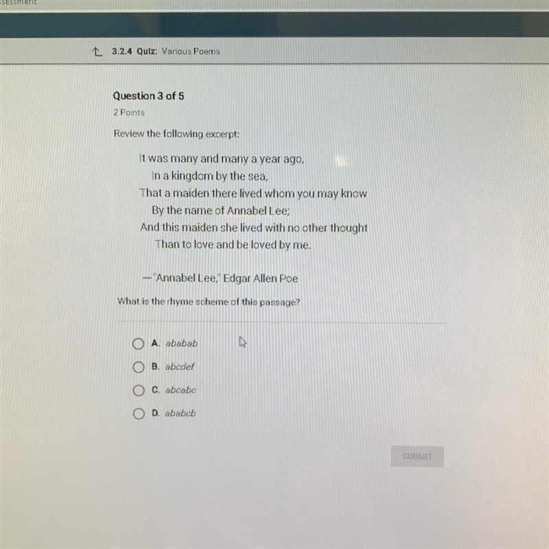 To find the rhyme scheme, you just have to write uppercase letters at the end of each line when you see that something rhymes. The first letter we start with is of course, a.