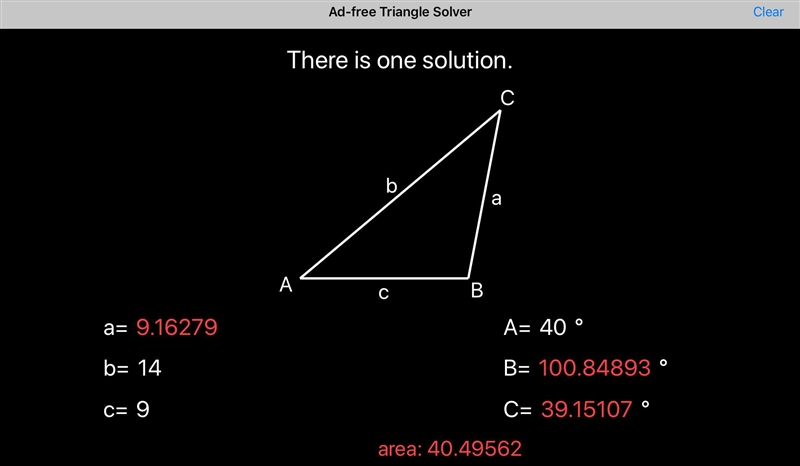 area = (1/2)bc·sin(A) = 63·sin(40°) ≈ 40.5 . . . . square units