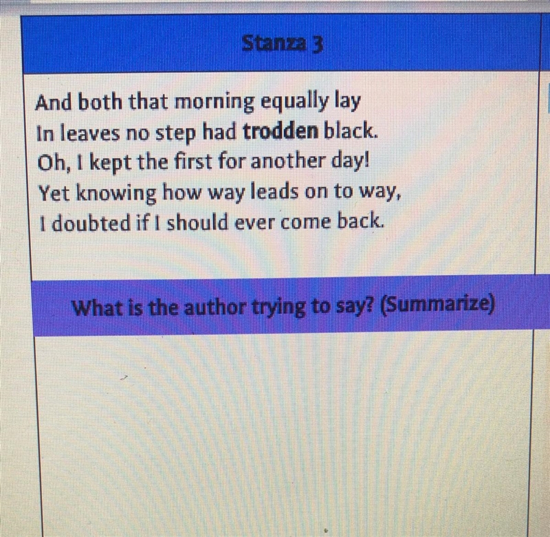 Basically, the author is talking about how there are many different yet often equal paths in life, some that have been take before and other that have never been "walked on' or, as the author writes, "trodden black". You can only take one path that might not be clear (as, in this case, it is covered in leaves) that leads on to other paths that you must also choose from along the way. This stanza, taken from the poem "Road Not Taken" that Robert Frost wrote, is a representation of moving on to the next step - or path - in life.