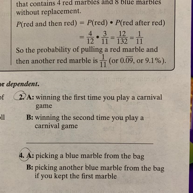 When you pick a blue marble, it decreases the total number of blue marbles there are, so that affects the outcome of p(b)